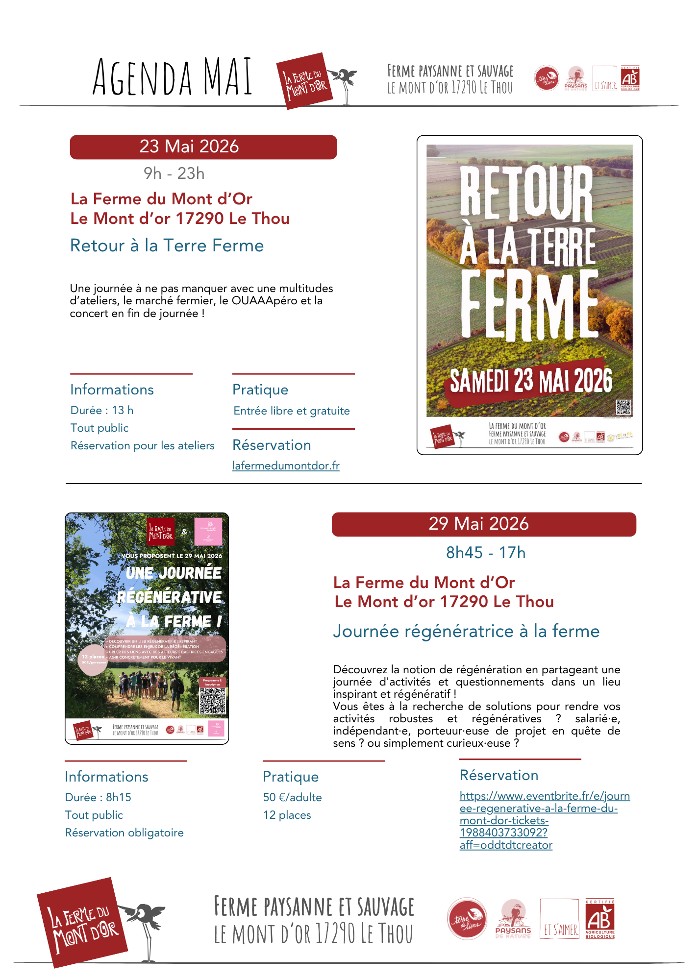 Pour s’inscrire à l’un des évènements de la ferme, il suffit de réserver votre place dans les commandes ci-dessous.